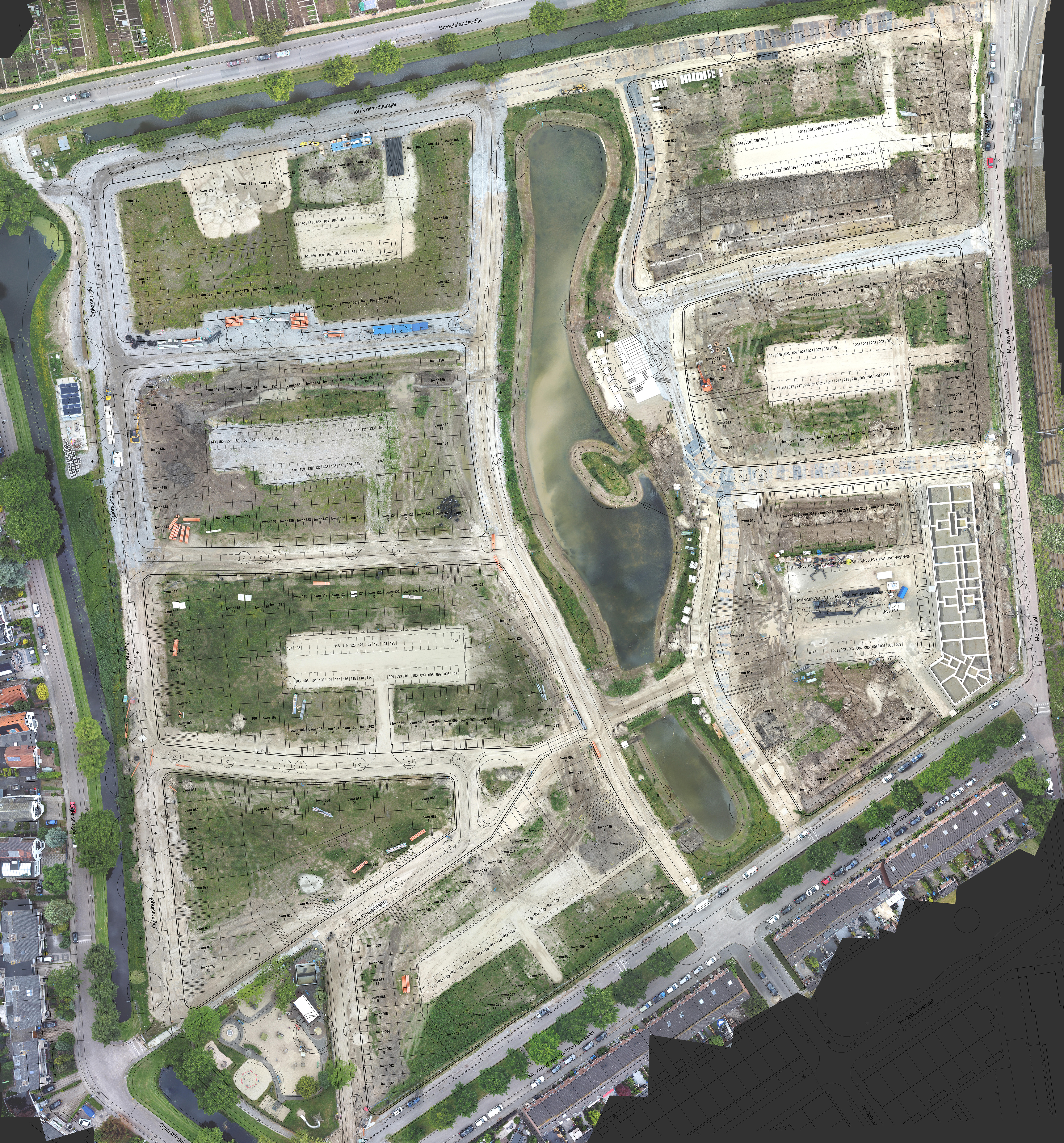 Hier kun je fotos downloaden van de bouwplaats met de kavelindeling erover heen